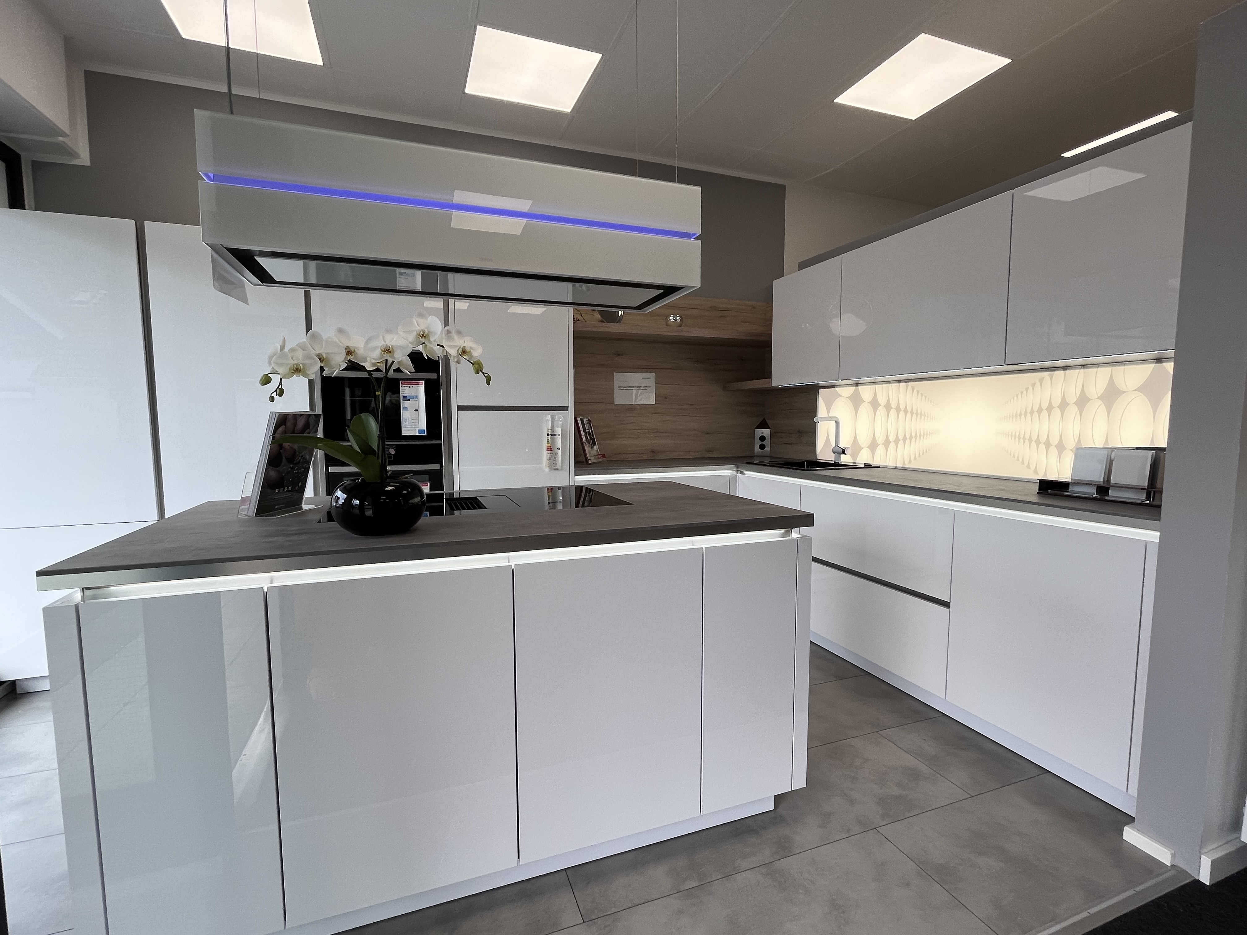 Hochglanzküche in strahlendem Weiß mit großzügiger Kochinsel und schwebender Inselhaube mit blauer LED-Beleuchtung. Dekorative Rückwand, warme Holzakzente und farbige LED-Lichteffekte schaffen eine harmonische, moderne Atmosphäre – live erlebbar in unserer Ausstellung in Oberhausen.